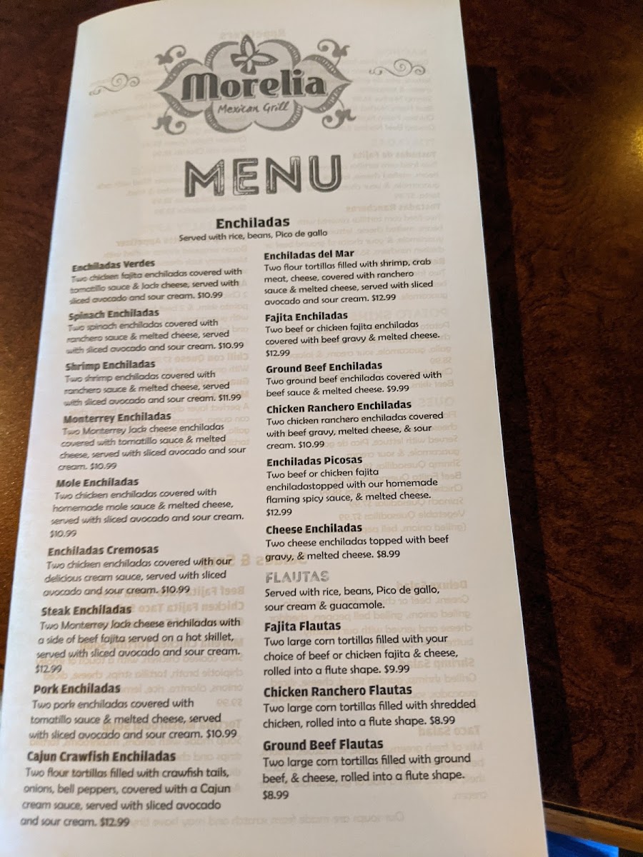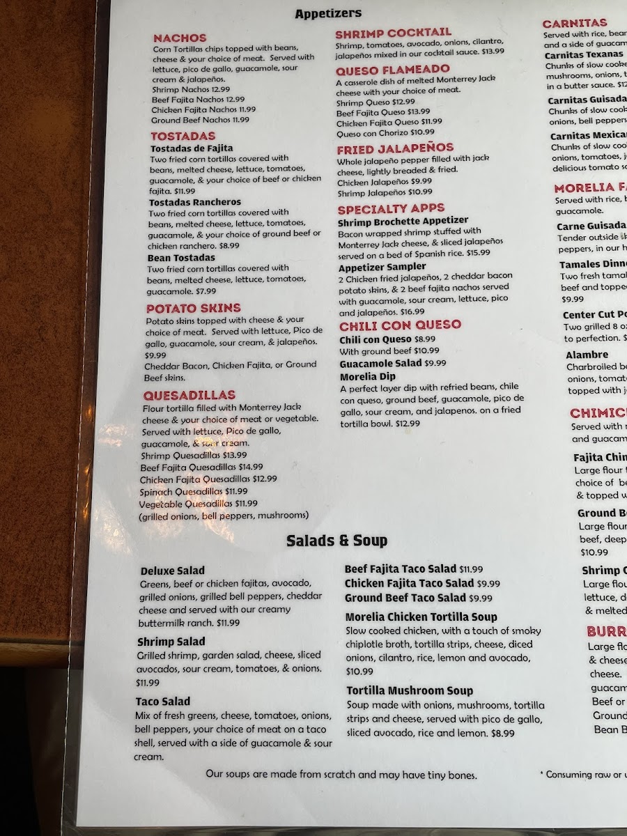 The menu at Morelia Mexican Grill in Bastrop offers a variety of traditional Mexican dishes alongside popular Tex-Mex favorites. The selection is organized into several categories, allowing guests to choose from appetizers, main courses, and specialty items suited for casual dining and catering needs.